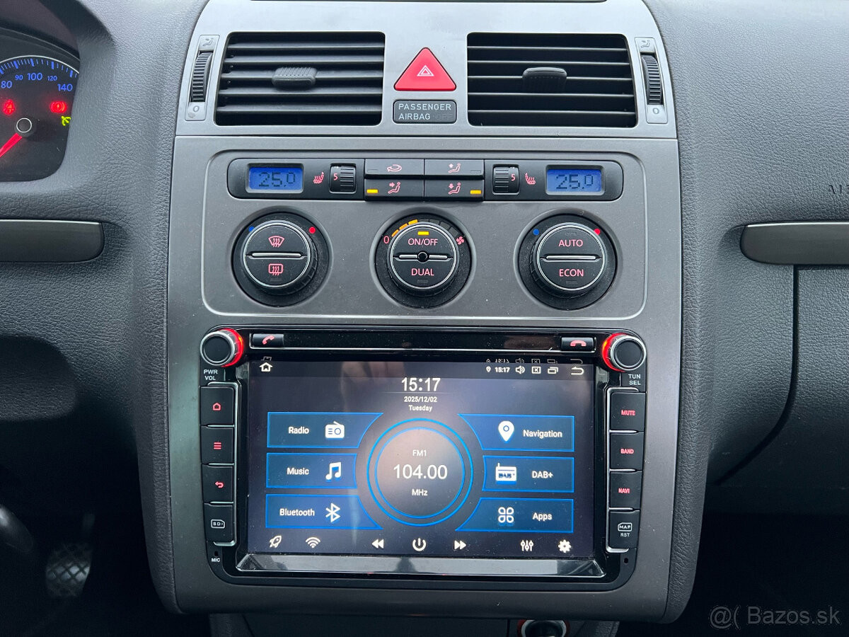 Predám Volkswagen Touran facelift 1,9TDI nafta, 77kW, MT/6, rok:05.2007. KM:221000. VIN číslo na vyžiadanie. Výbava: 4x el. okná, el. a vyhrievané spätné zrkadlá, palubný počítač, tempomat, výškovo nastaviteľný volant a predné sedadlá, vyhrievané predné sedadlá, automatická dvojzónová klimatizácia, Android rádio s bluetooth pripojením a navigáciou, dažďový a svetelný senzor, nezávislé kúrenie (WEBASTO), ostrekovanie svetlometov, strešné nosiče, parkovacie senzory vpredu aj vzadu, parkovací asistent, ťažné zariadenie ktoré je riadne zapísané v TP, ABS, ESP, servoriadenie a iné. Posledný servis: vymenená spojka, vymenené tlmiče. STK a EK je platná do 24.09.2027. Cena auta je 5990 euro plus dohoda možná. Možnosť vybaviť aj na splátky (nie na notársku zmluvu). Tel.č.:0944117396