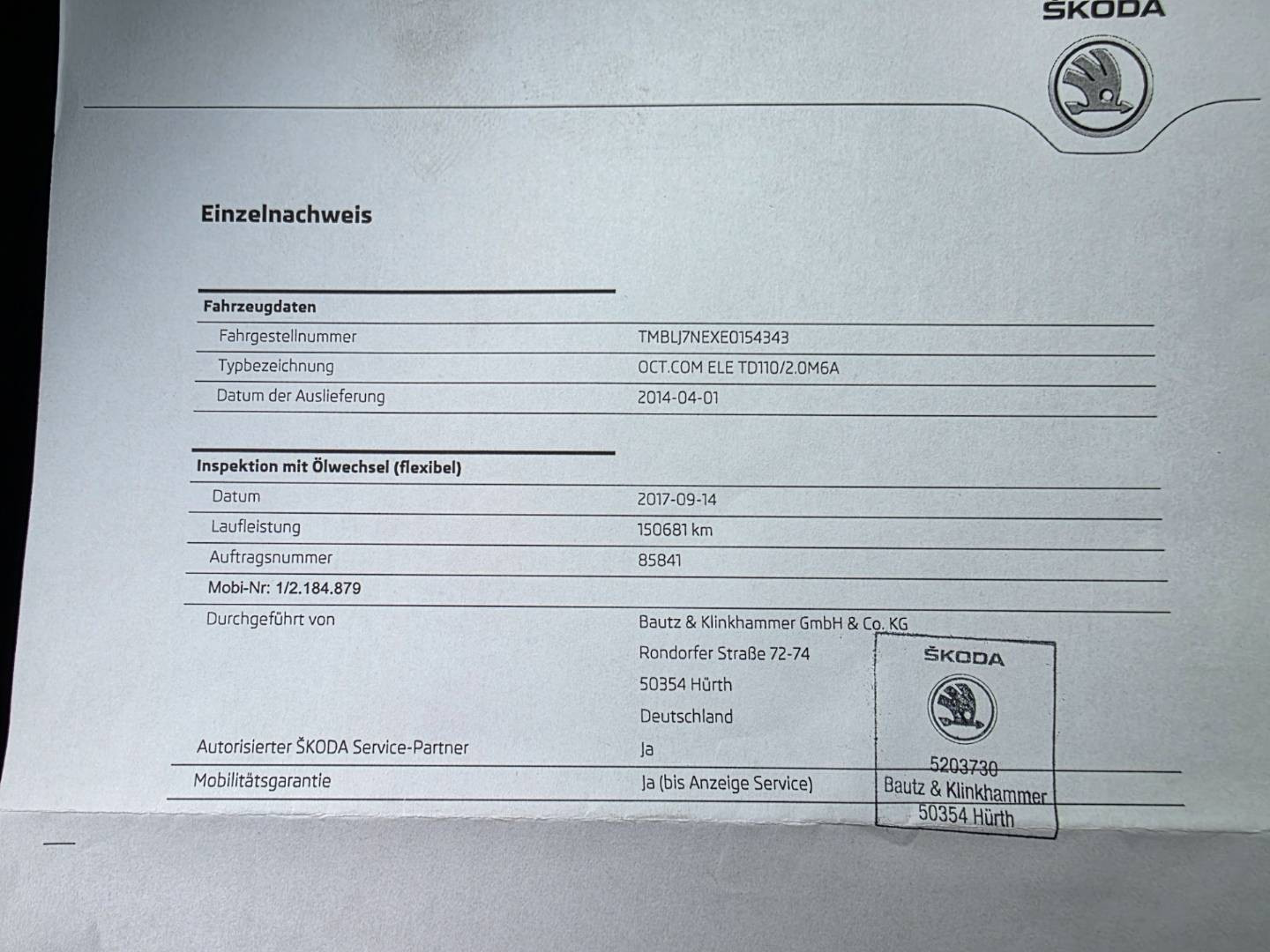 VIN: TMBLJ7NEXE0154343